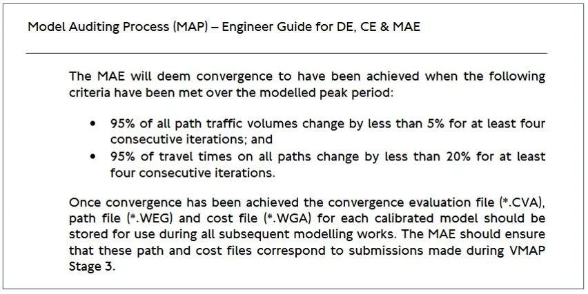 First of all, an understanding of how to check if a model is appropriately converged is needed and which criteria should be used. TfL’s ‘Model Auditing Process (MAP), v3.5, Section V222’ provides details on how to check model convergence, as shown in Figure 1.
