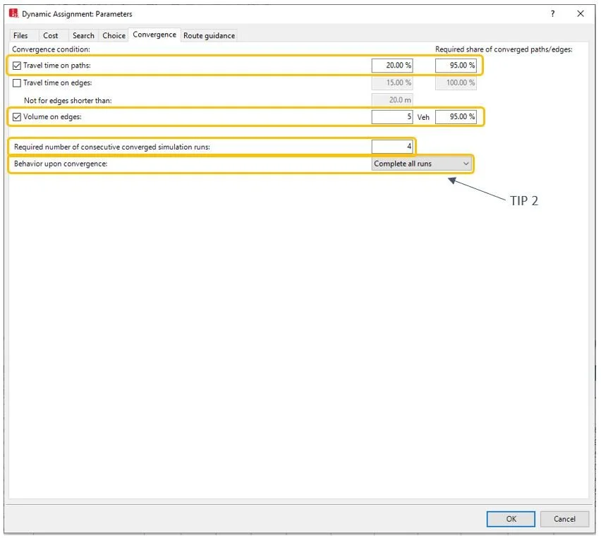 Our interpretation of this for microsimulation models is to output and compare the ‘Total Travel Time’ from the Overall Network Performance evaluation. This is checked for each convergence run and if the difference in Total Travel Times is within 1% for four or more consecutive iterations, then the model is considered stable.
